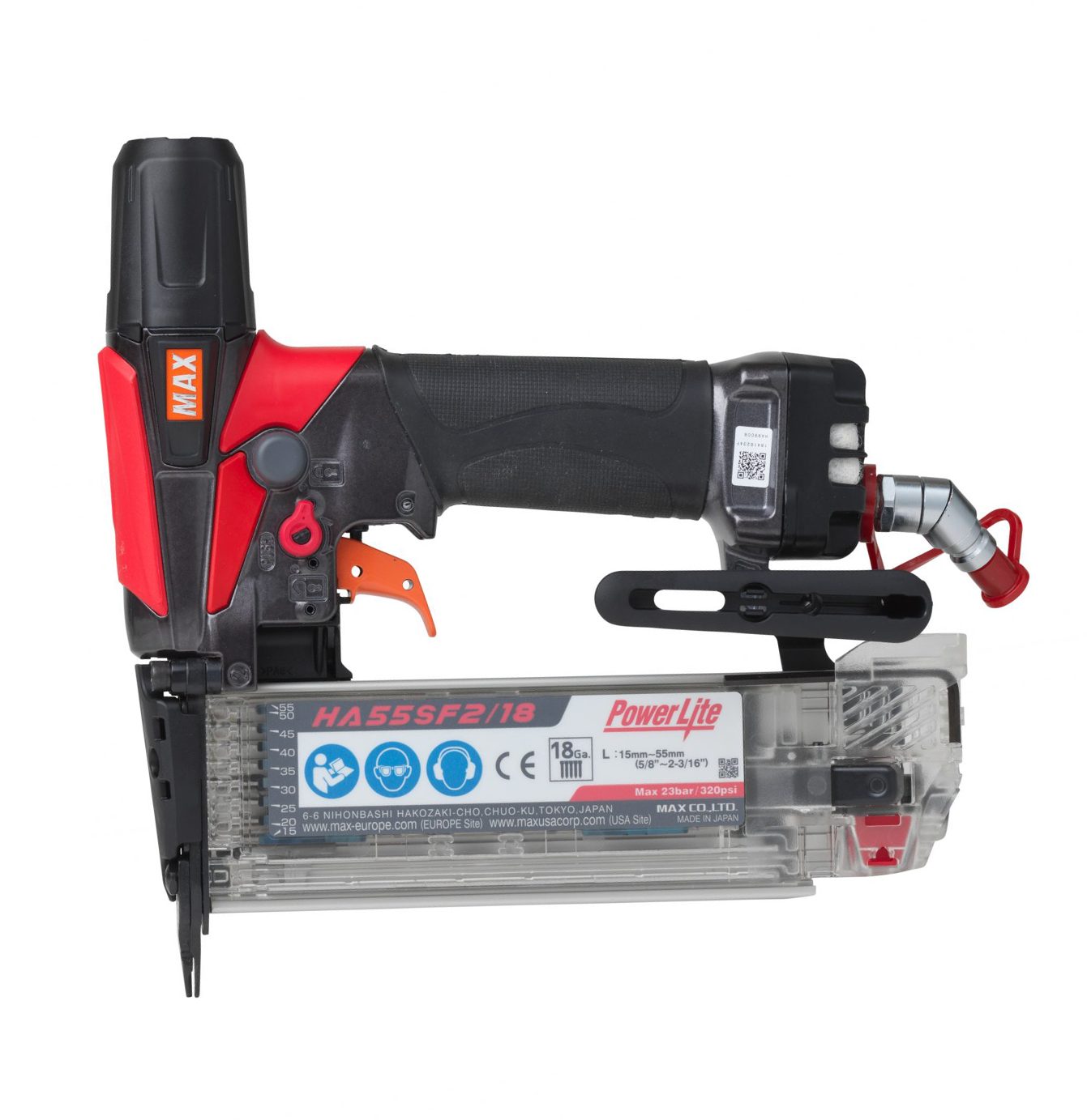 The MAX HA55SF2 is a top of the line professional grade pneumatic brad nailer powered by MAX's Powerlite compressor. The HA55SF2 can shoot up to 55mm brad nail. This compact bard nailer can be used for interior application.