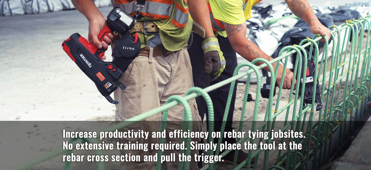 The MAX RE-BAR-TIER is conservatively 5 times faster than hand tying. With an approximate tying speed of less than 1 sec. MAX RE-BAR-TIERs reduce the time spent tying, consequently reducing the man hours necessary to complete a job.